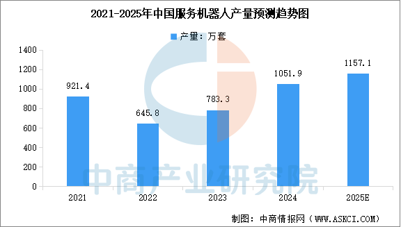 隨著新興應用場景的拓展,服務機器人市場需求日益旺盛,產量大幅增長。2024年服務機器人產量達到1051.9萬套,較上年增長34.29%。隨著服務機器人產業化落地加速,中商產業研究院分析師預測,2025年服務機器人產量將達到1157.1萬套。