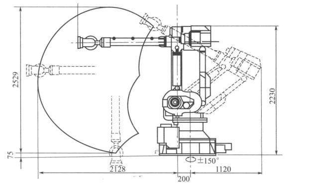 以持重100kg, Z高速度4m/s 的六軸垂直多關(guān)節(jié)機(jī)器人為例,其規(guī)格性能如圖6-1及 表6-2所示,這是一種典型的點(diǎn)焊機(jī)器人,可勝任大多數(shù)車體裝配工序的點(diǎn)焊作業(yè)。由于使 用中幾乎全部用來完成間隔為30~50mm 的打點(diǎn)焊接作業(yè),運(yùn)動中很少能達(dá)到Z高速度, 因此,改善Z短時間內(nèi)頻繁短節(jié)距啟動、制動的性能是本機(jī)追求的重點(diǎn)。為了提高加速度和減速度,在設(shè)計中注意減輕手臂的重量,增加驅(qū)動系統(tǒng)的輸出力矩。