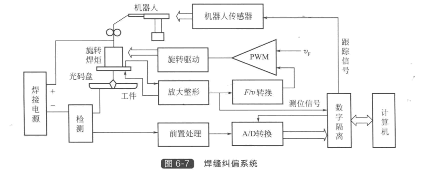 在弧焊機器人的第6個關節上,安裝一個焊炬夾持件,將原來的焊炬卸下,把高速旋轉掃描電弧傳感器安裝在焊炬夾持件上。焊縫糾偏系統如圖6-7所示,高速旋轉掃描電弧傳感 器的安裝姿態與原來的焊炬姿態一樣,即焊絲端點的參考點的位置及角度保持不變。