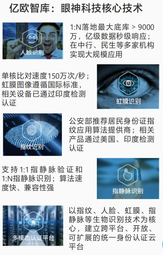 眼神科技是一家AI驅(qū)動的多模態(tài)生物識別技術(shù)解決方案提供商,擁有指紋識別、虹膜識別、人臉識別、指靜脈識別等多種自主知識產(chǎn)權(quán)生物識別技術(shù),并成功打造了多模態(tài)生物識別統(tǒng)一平臺,實現(xiàn)多場景、多應(yīng)用、多產(chǎn)品、多種識別技術(shù)統(tǒng)一管理。眼神科技基于多模態(tài)生物識別核心算法和統(tǒng)一平臺,賦能合作伙伴,實現(xiàn)場景落地,已經(jīng)服務(wù)于 2000+客戶,涵蓋了金融、教育、社保、公安、政府、軍隊以及企事業(yè)單位等多個L域, 與全國80%以上銀行機(jī)構(gòu)和超過100所G校達(dá)成合作。