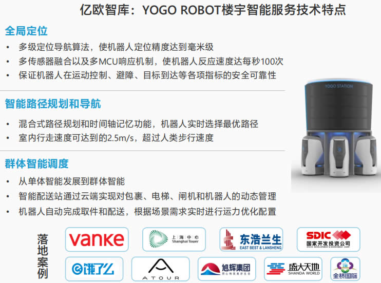YOGO ROBOT專注智能配送機器人系統解決方案開發,發力末端配送。其核心產品包括群體機器人配送系統YOGO STATION、單體配送機器人 Mingo、KAGO系列,以及智能電梯、智能閘機等IoT系統解決方案。整套系統具備延展性,可疊加安防、巡邏、辦公等功能,廣泛適用于寫字樓、 商場、園區、酒店、文博展覽等場景。配套的大數據智能管理平臺,用戶可便易操作,進行可視化管理。系統目前已在萬科、國投集團、旭輝集團、 東浩蘭生等物業投入使用,并在上海、北京、蘇州等城市形成規;季。2019年5月,YOGO與寶山區政府合作,打造機器人智慧樓宇集群。
