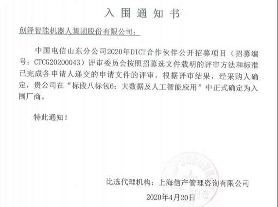 近日,中國(guó)聯(lián)通山東省分公司、中國(guó)電信山東分公司分別對(duì)外公示了2020DICT合作伙伴公開招募項(xiàng)目、2020年專業(yè)類 5G 應(yīng)用公開市場(chǎng)供應(yīng)商招募項(xiàng)目入圍單位名單。創(chuàng)澤集團(tuán)從眾多投標(biāo)商家中脫穎而出,接連中標(biāo)入圍。 另外,前段時(shí)間創(chuàng)澤集團(tuán)已與中國(guó)移動(dòng)已經(jīng)成立了“5G+AI聯(lián)合創(chuàng)新實(shí)驗(yàn)室”,目前和中國(guó)移動(dòng)的智慧銀行、智慧醫(yī)院項(xiàng)目正在有序推進(jìn)中。