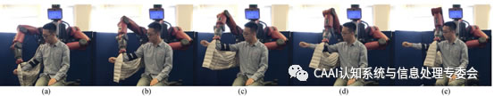 圖3展示了完整的穿衣過程。當用戶在穿衣過程抬起胳膊時,機器人也相應改變軌跡來減少受力情況,并實時運行至新的肘關節和肩關節位置。