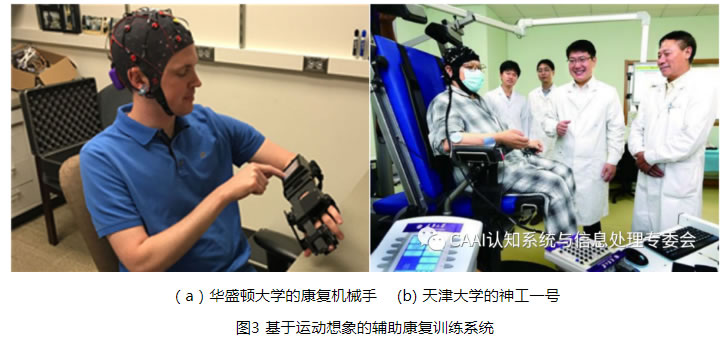 美國凱斯西儲大學(xué)Daly等通過運動想象檢測大腦皮層神經(jīng)元的激活情況,表明BCI系統(tǒng)能有效地輔助患者誘發(fā)腦功能重塑并降低大腦皮層的異常激活。即主動的運動感知和被動外部設(shè)備相結(jié)合形成主被動康復(fù)訓(xùn)練系統(tǒng),將有利于受試者肢體的運動功能康復(fù)[4]。華盛頓大學(xué)Bundy等通過健側(cè)手部動作運動意圖輔助患者控制外骨骼機(jī)械手,實現(xiàn)了患者在日常生活中執(zhí)行康復(fù)訓(xùn)練[5],如圖3(a)所示。主被動康復(fù)訓(xùn)練系統(tǒng)不僅能輔助正常受試者康復(fù)訓(xùn)練,而且在患者的康復(fù)訓(xùn)練中也取得了一定的進(jìn)展。德國圖賓根大學(xué)VárkutiB等通過運動想象控制MIT-MANUS機(jī)器人輔助患者上肢執(zhí)行康復(fù)訓(xùn)練,結(jié)果表明上肢運動功能得到明顯改善[6]。如圖3(b)所示天津大學(xué)明東教授團(tuán)隊通過患者肘關(guān)節(jié)屈-伸運動想象控制“神工一號”康復(fù)機(jī)器人輔助肘關(guān)節(jié)的康復(fù)運動,增強(qiáng)了康復(fù)訓(xùn)練效果。西安交通大學(xué)徐光華教授團(tuán)隊研究了目標(biāo)誘導(dǎo)的運動想象刺激范式,證明了有目標(biāo)導(dǎo)向的運動想象增強(qiáng)了對大腦皮層的激活并改善運動想象的能力[7]。韋恩州立大學(xué)Whyte等進(jìn)一步提出了規(guī)范康復(fù)訓(xùn)練體系可幫助患者主動參與康復(fù)訓(xùn)練[8]。