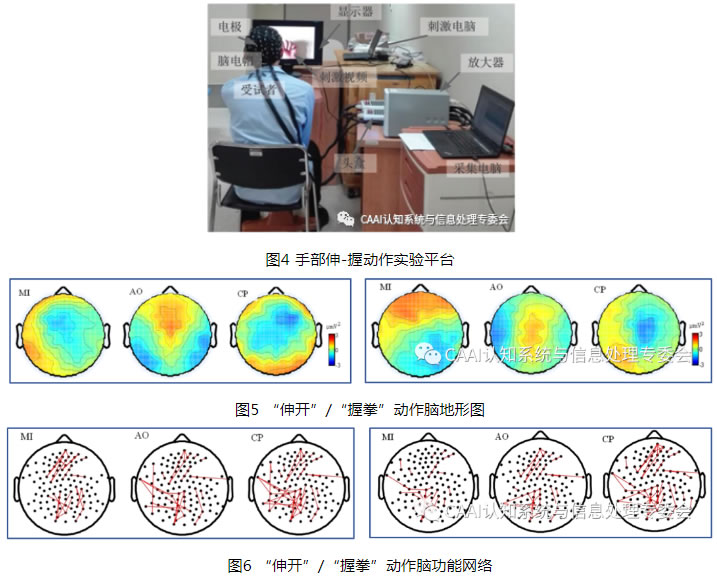 為了提G運動想象動作與所需要的康復(fù)肢體的直接相關(guān)性,本課題組設(shè)計了手部伸-握動作直接相關(guān)的運動想象和動作觀察相結(jié)合的復(fù)合范式實驗,以實現(xiàn)更好的手部主動康復(fù)。運動想象是讓受試者去想象某一個動作,不用產(chǎn)生任何肌肉活動,調(diào)動主觀意念在心理上反復(fù)模擬或復(fù)現(xiàn)相應(yīng)動作。動作觀察是讓受試者觀看日常生活手的基本動作(如抹桌子、洗衣服等視頻動作),然后盡力去模仿視頻中所出現(xiàn)的動作。通過ERSP(時間相關(guān)譜擾動)、腦地形圖和腦功能網(wǎng)絡(luò)計算分析了伸-握動作運動想象和動作觀察對大腦皮層的激活規(guī)律。