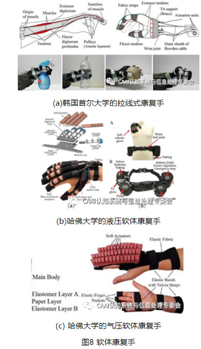 現(xiàn)有的軟體康復(fù)手大多采用拉線驅(qū)動、液壓驅(qū)動和氣壓驅(qū)動。韓國首爾大學(xué)的HyunKi In等人[10]設(shè)計了如圖8(a)所示的一種拉線驅(qū)動的軟體康復(fù)手Exo-Glove,在柔性織物手套的指套手背側(cè)和手掌側(cè)鋪設(shè)繞性金屬絲,驅(qū)動電機(jī)拉動繞性金屬絲,即可輔助手指的完成屈曲和伸展動作,指捏力量為20N,掌握力量為40N,驅(qū)動控制系統(tǒng)與手套本體分離使手套僅重196g,大可以抓握直徑76mm的物體。哈佛大學(xué)的Panagiotis等人[11]設(shè)計了如圖8(b)所示的一款重量為285g的輔助患者抓握的液壓驅(qū)動的軟體康復(fù)手,并配備了一個重量為3.3kg的液壓驅(qū)動控制便攜式腰包。該液壓軟體康復(fù)手的軟體驅(qū)動器,由纖維增強(qiáng)材料制作的成型彈性腔與約束線、限制層組合制作,在增壓時可完成屈曲、扭轉(zhuǎn)、伸長等運動,可以輔助手指完成主動屈曲運動和被動伸展運動。哈佛大學(xué)的Stacey Lyne等人[12]利用3D打印模具進(jìn)行軟材料澆鑄制作氣動軟體驅(qū)動器,從而制作成如圖8(c)所示的重量約為160g的 PneuNet 軟體康復(fù)手。該氣動軟體驅(qū)動器在靠近手背側(cè)嵌入彈性模量大的限制層,使驅(qū)動氣腔在增壓時向彈性模型大的一側(cè)彎曲,實現(xiàn)輔助手指主動驅(qū)動運動,氣壓為0.45Mpa時指尖壓力為1.2N。