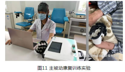 手部主被動訓(xùn)練系統(tǒng)可分為主動康復(fù)和被動康復(fù)兩個部分。在主動康復(fù)訓(xùn)練中,對于患者主動意圖的感知有兩種:一種是在多范式刺激大腦皮層的基礎(chǔ)上,從增強(qiáng)的EEG 中直接提取單側(cè)手部伸-握動作精細(xì)意圖的EEG 特征,實現(xiàn)對受試者手部動作的精細(xì)意圖感知;另一種是發(fā)揮不同模式如EEG、眼電圖(Electrooculogram,EOG)和肌電圖(Electromyogram, EMG)模式的優(yōu)勢,構(gòu)建多模式協(xié)同控制策略以產(chǎn)生更多的控制指令。在被動康復(fù)訓(xùn)練中,通過主動運動意圖產(chǎn)生的控制指令或直接輸入指令對軟體康復(fù)手進(jìn)行驅(qū)動控制,實現(xiàn)軟體康復(fù)手輔助手部執(zhí)行康復(fù)訓(xùn)練或進(jìn)行日常生活。實驗驗證了系統(tǒng)輔助患者在線被動康復(fù)訓(xùn)練,通過正常受試者在線控制康復(fù)機(jī)械手輔助執(zhí)行伸-握動作,其平均正確率達(dá)到92.71%,基本滿足主被動康復(fù)訓(xùn)練的要求,也提升了主被動康復(fù)系統(tǒng)的實用化水平。同時,該手部主被動康復(fù)訓(xùn)練系統(tǒng)成功在多家醫(yī)院和兩家企業(yè)進(jìn)行康復(fù)試用。