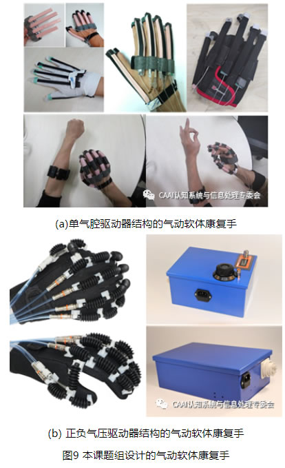 鑒于拉線式軟體康復(fù)手的驅(qū)動傳動系統(tǒng)較復(fù)雜、對手的壓迫感較強(qiáng),液壓軟體康復(fù)手重量較大、有泄露污染的風(fēng)險,本課題組對重量更輕、成本更低、驅(qū)動控制較為簡單的氣動軟體康復(fù)手展開了研究。前期,本課題組利用限制層和纖維約束的單氣腔驅(qū)動器結(jié)構(gòu)設(shè)計,并基于電容變化原理利用介電彈性材料制作柔性傳感器,設(shè)計了如圖9(a)所示的集成柔性傳感器的氣動軟體康復(fù)手,改變限制層方向,可以輔助人手分別實現(xiàn)主動伸展和主動屈曲運動,并檢測手指彎曲角度進(jìn)行康復(fù)效果評估[13]。但是該氣動軟體康復(fù)手無法輔助人手實現(xiàn)拇指的內(nèi)收/外展運動,也無法同時實現(xiàn)伸展/屈曲運動的雙向主動訓(xùn)練。為此,本課題組又利用波紋管制作的正負(fù)氣壓驅(qū)動器制作了如圖9(b)所示的氣動軟體康復(fù)手。該氣動軟體康復(fù)手僅有149克,采用開放式手套,通過欠驅(qū)動可以輔助手指實現(xiàn)伸展/屈曲運動和拇指的內(nèi)收/外展運動的主動訓(xùn)練;配套的便攜式氣動箱體積小、重量輕,G級康復(fù)版氣動箱可調(diào)節(jié)六個輸出氣路的壓力和流量;實驗表明,伸展/屈曲驅(qū)動器在伸展時的大作用力為4.6N,內(nèi)收/外展驅(qū)動器在內(nèi)收時大作用力為8.1N。當(dāng)前,該氣動軟體康復(fù)手的驅(qū)動器設(shè)計、控制設(shè)計仍在不斷地進(jìn)行優(yōu)化。
