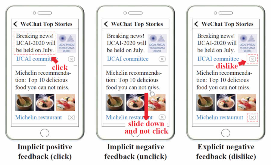 推薦系統(tǒng)在日常生活中被廣泛使用,為用戶(hù)獲取信息與娛樂(lè)提供便利。推薦系統(tǒng)算法往往基于用戶(hù)與系統(tǒng)的交互,這些交互行為可以大致分為以下兩類(lèi):顯式反饋與隱式反饋。顯式反饋從用戶(hù)對(duì)于物品的直接態(tài)度中獲取,例如評(píng)論中的一星到五星,或者微信看一看系統(tǒng)中的“不感興趣”按鈕。這類(lèi)反饋能夠直接表達(dá)用戶(hù)的正向以及負(fù)向偏好,但是這類(lèi)反饋的數(shù)量往往不多。隱式反饋從用戶(hù)的行為中間接獲得,例如用戶(hù)的點(diǎn)擊/不點(diǎn)擊行為。這些信息在推薦系統(tǒng)中往往是海量的,但是這些信息有著較多噪聲(用戶(hù)點(diǎn)擊的并不一定是他真正喜歡的)。另外,隱式反饋通常是以正反饋的形式出現(xiàn),推薦中的隱式負(fù)反饋存在巨大噪聲(未展現(xiàn)信息或者未點(diǎn)擊信息并不一定意味著用戶(hù)不喜歡這些內(nèi)容)。