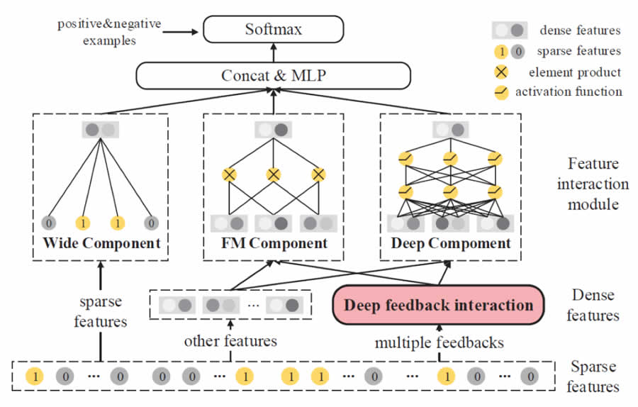 DFN模型主要分為三個(gè)階段:首先,deep feedback interaction module以用戶(hù)的多種反饋行為作為輸入,輸出用戶(hù)的反饋特征。然后,F(xiàn)eature Interaction Module進(jìn)一步考慮用戶(hù)的其它特征和物品特征,使用FM、Deep和Wide層進(jìn)行特征交互。后,輸出層使用CTR作為訓(xùn)練目標(biāo)。圖2給出了DFN的整體結(jié)構(gòu)。