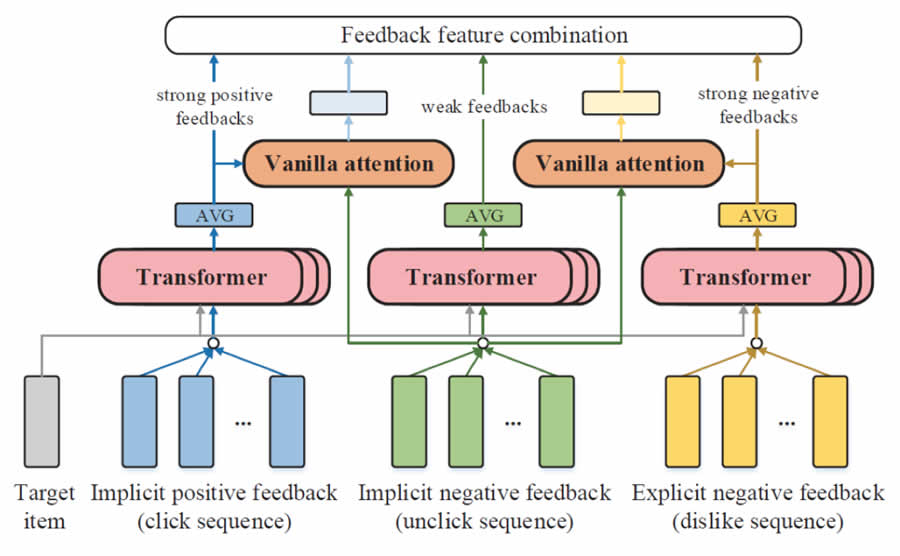 在推薦系統(tǒng)中,用戶(hù)的顯式反饋、隱式反饋、正反饋和負(fù)反饋都能夠反映用戶(hù)對(duì)于被推薦物品的偏好。這些反饋信息在推薦系統(tǒng)中十分有用。然而,現(xiàn)在的大規(guī)模深度推薦模型往往以點(diǎn)擊為目標(biāo),只看重以用戶(hù)點(diǎn)擊行為為代表的隱式正反饋,而忽略了其它有效的用戶(hù)反饋信息。