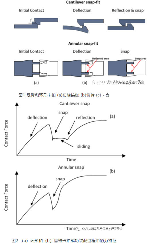 零件在不同的裝配階段產(chǎn)生的作用力可用于描述過程狀態(tài)。圖2所示的兩種卡扣的力特征圖具有不同的形狀,可用于及時識別裝配過程的完成情況。在這兩種情況下,物體的偏轉(zhuǎn)都會產(chǎn)生一個恒定的力,一旦部件的力消失,力就會急劇下降,當(dāng)兩部分鎖定在一起時,力就會增大。懸臂卡扣在鎖定之前,兩個部件相互滑動,產(chǎn)生一個恒定的摩擦力,該摩擦力由于部件的材質(zhì)屬性造成的力載荷不同而變化。環(huán)形卡扣則不存在滑動。力信號的確切形狀取決于連接部件的機(jī)械性能和卡扣類型。環(huán)形和懸臂是兩個J端情況,環(huán)形卡扣是在恒定的力載荷下,而懸臂卡扣在咬合后載荷消失。