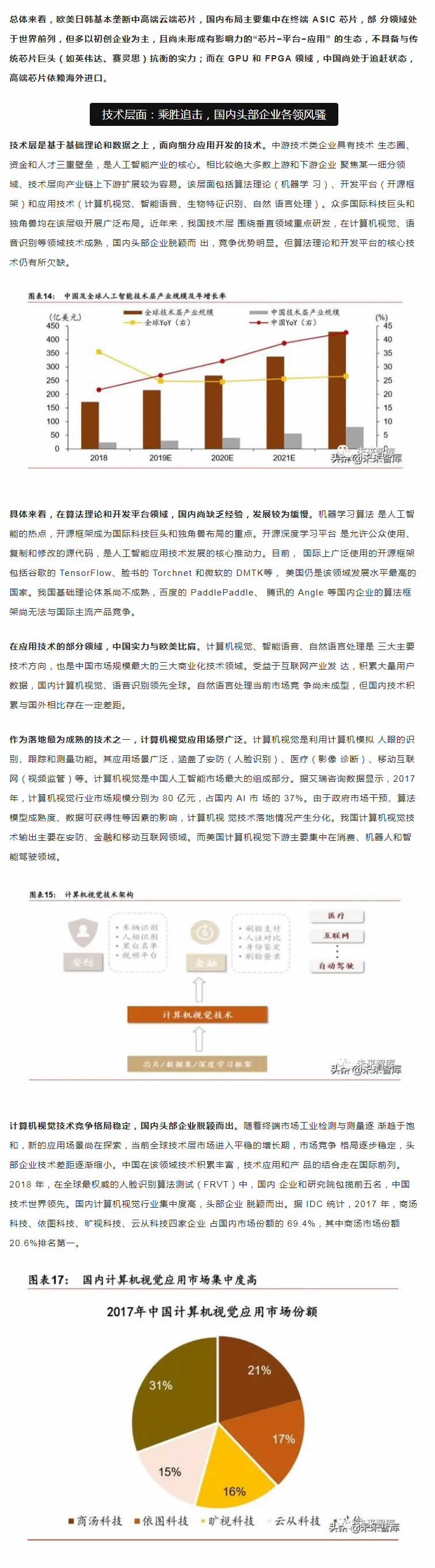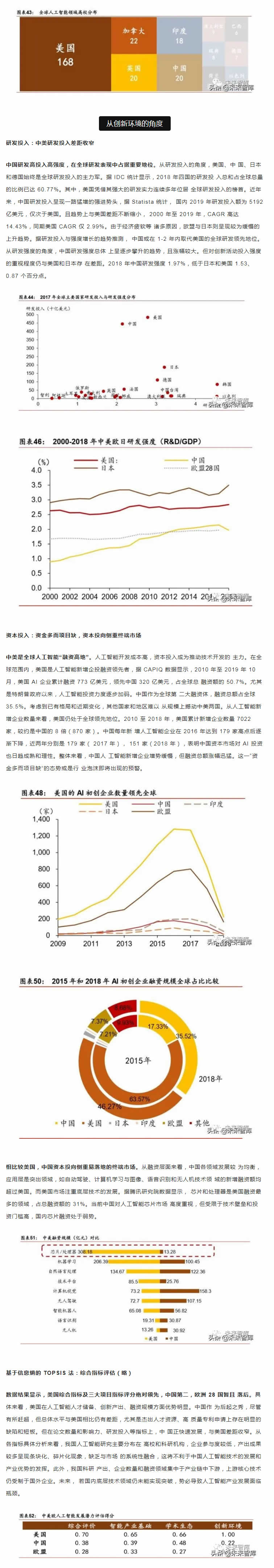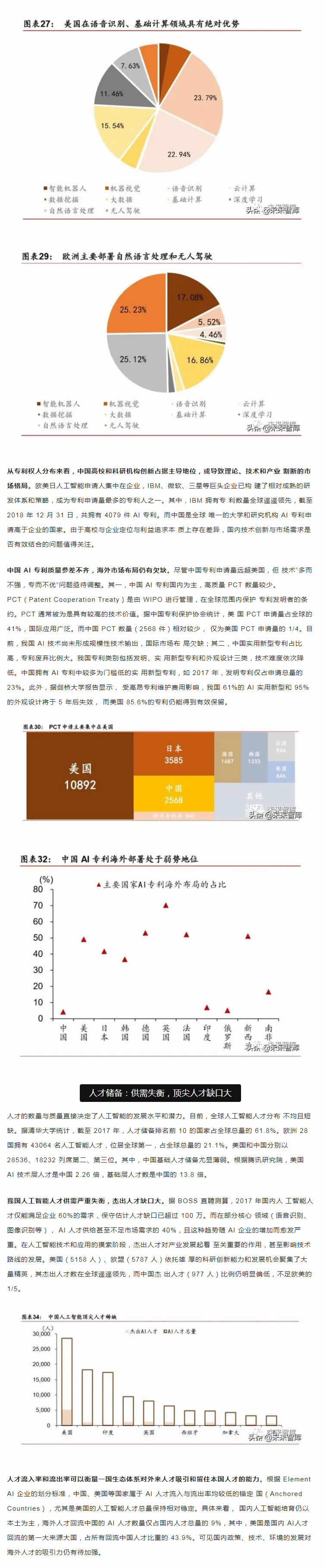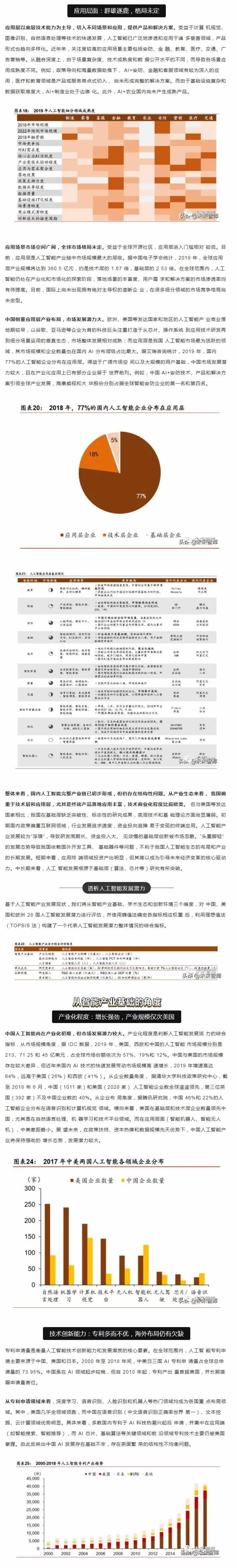 從中短期看,技術優化、落地場景的開拓和滲透是是主要的增長點;從長期看,智能生 態體系建設才是彎道超車的必由之路。人工智能產業的核心競爭力在于生態體系的建設, 包括大數據、算法理論、底層技術、應用生態、人才儲備等層面。而我國人工智能產業生 態和基礎設施建設正處于探索期,如何實現核心技術的突破和拓寬人工智能技術與社會經 濟融合場景著力點在于人才儲備和持續的研發投入。從人才的角度,收窄技術差距的根本 在于優化人的知識結構和能力。當前政策應側重建立人才培養體系,為人工智能打造人才 資源池,尤其是在基礎學科L域突破人才瓶頸。同時,打破“唯數量論”的科研評價和考 核體系,改變人才激勵機制勢在必行。我國人工智能專利申請和科研產出數量L先, 但質量堪憂。唯有從源頭改變評價機制,才能扭轉“量多而質優”的問題。從研發的角度, 企業技術優化和創新能力是解決產業痛點的關鍵。基礎研究的投入周期長、不確定性大、 和風險G特點決定了其難以短期內獲得投資回報,但基礎L域的突破將為經濟帶來長期和 廣泛的溢出效應,因此,國內更應關注底層技術的研發投入,扭轉傳統技術路徑,顛覆核 心技術受制于人的被動局面。此外,人工智能在賦能機器模擬人類進行決策的同時產生的 倫理道德、隱私保護和社會安全問題值得關注。由于法律法規存在滯后性,尚無法對人工 智能技術進行有效監管。我國應加快人工智能倫理研究,及早識別人工智能治理風險。