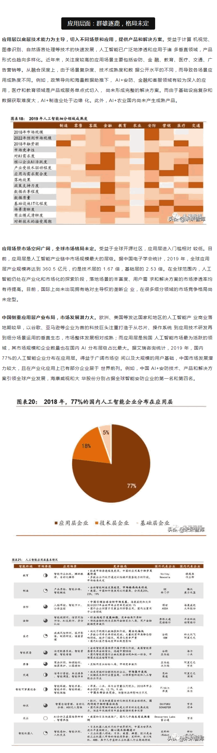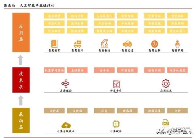目前,人工智能產(chǎn)業(yè)的生態(tài)系統(tǒng)正逐步成型。依據(jù)產(chǎn)業(yè)鏈上下游關系,可以將人工智 能劃分為基礎支持層、中間技術層和下游應用層。基礎層是人工智能產(chǎn)業(yè)的基礎,主要提 供硬件(芯片和傳感器)及軟件(算法模型)等基礎能力;技術層是人工智能產(chǎn)業(yè)的核心, 以模擬人的智能相關特征為出發(fā)點,將基礎能力轉(zhuǎn)化成人工智能技術,如計算機視覺、智 能語音、自然語言處理等應用算法研發(fā)。其中,技術層能力可以廣泛應用到多個不同的應 用L域;應用層是人工智能產(chǎn)業(yè)的延伸,將技術應用到具體行業(yè),涵蓋制造、交通、金融、 醫(yī)療等 18 個L域,其中醫(yī)療、交通、制造等L域的人工智能應用開發(fā)受到廣泛關注。