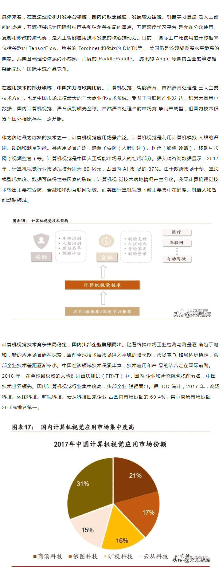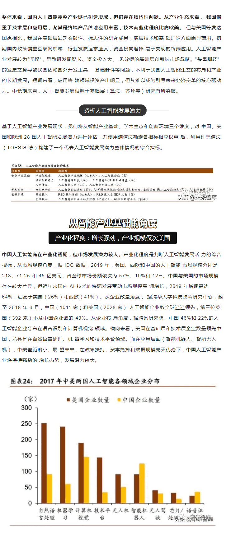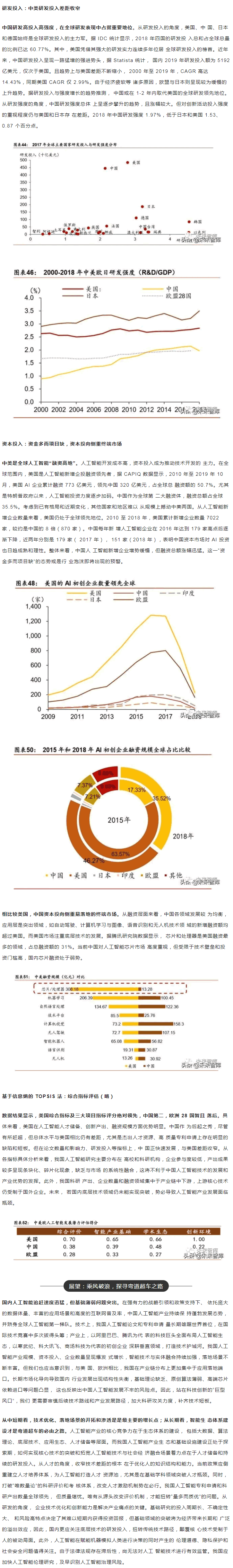 范圍內(nèi),中美“雙雄并立”構(gòu)成人工智能D一梯隊,日本、英國、以色列和法國等發(fā) 達國家乘勝追擊,構(gòu)成D二梯隊。同時,在D層設計上,多數(shù)國家強化人工智能戰(zhàn)略布局, 并將人工智能上升至國家戰(zhàn)略,從政策、資本、需求三大方面為人工智能落地保駕護。后起之秀的中國,局部L域有所突破。中國人工智能起步較晚,發(fā)展之路幾經(jīng)沉浮。自 2015 年以來,政府密集出臺系列扶植政策,人工智能發(fā)展勢頭迅猛。由于初期我國政策 側(cè)重互聯(lián)網(wǎng)L域,資金投向偏向終端市場。因此,相比美國產(chǎn)業(yè)布局,中國技術層(計算 機視覺和語音識別)和應用層走在世界前端,但基礎層核心L域(算法和硬件算力)比較 薄弱,呈“頭重腳輕”的態(tài)勢。當前我國人工智能在國家戰(zhàn)略層面上強調(diào)系統(tǒng)、綜合布局。
