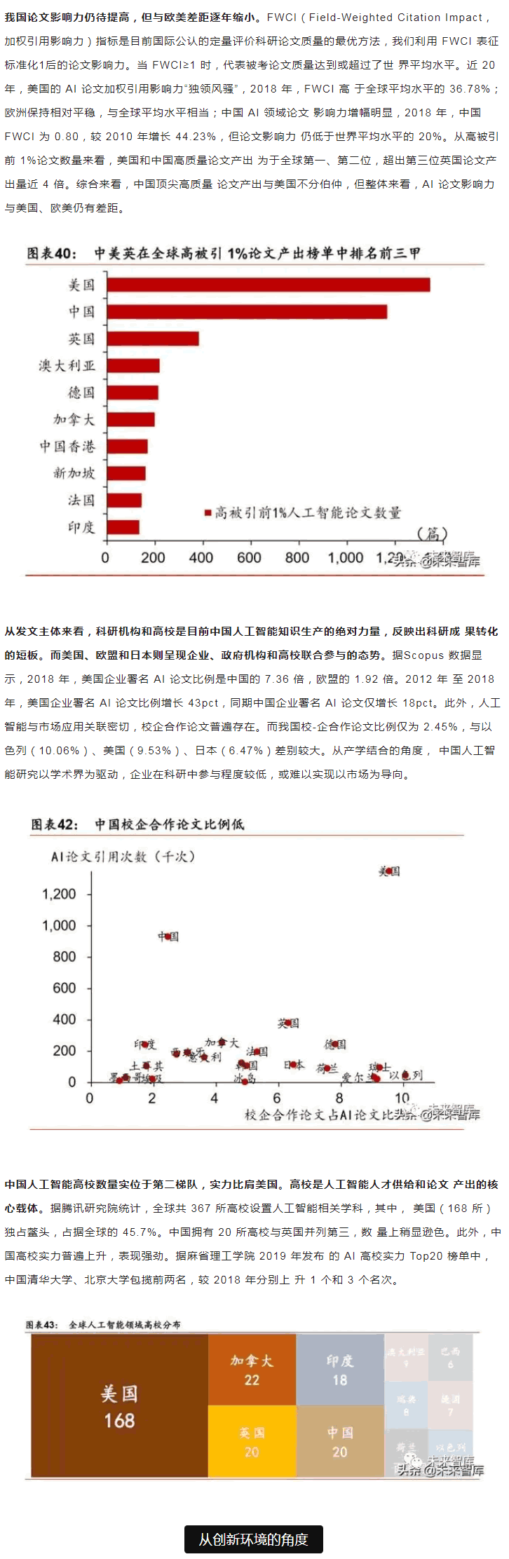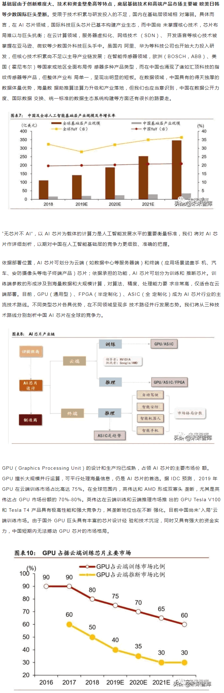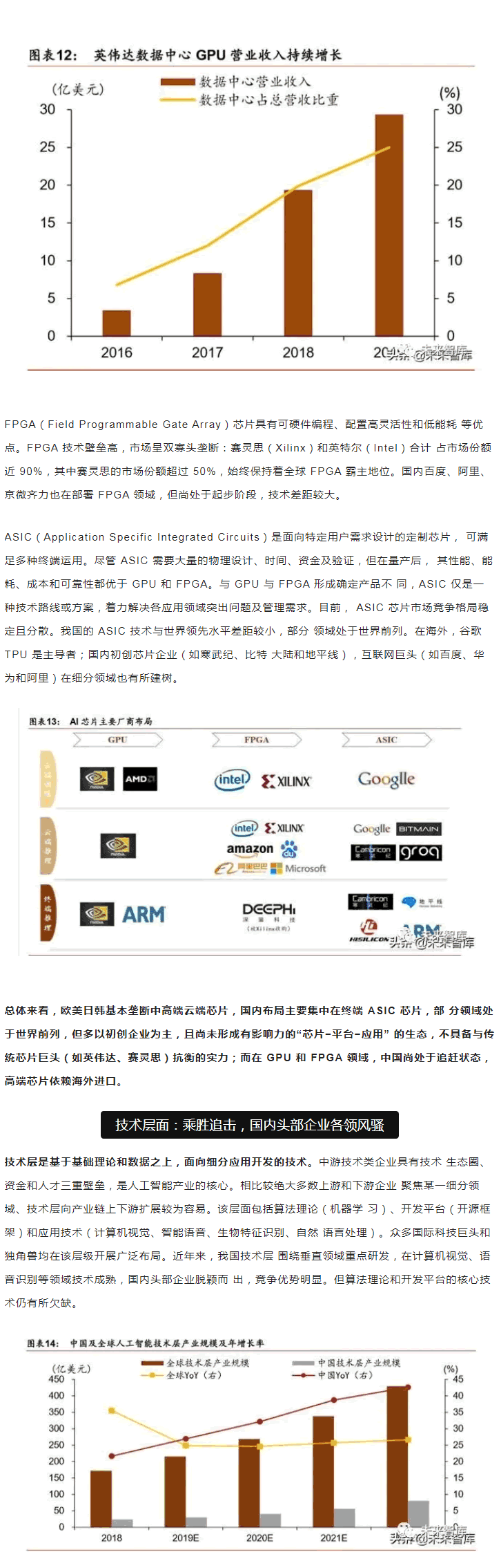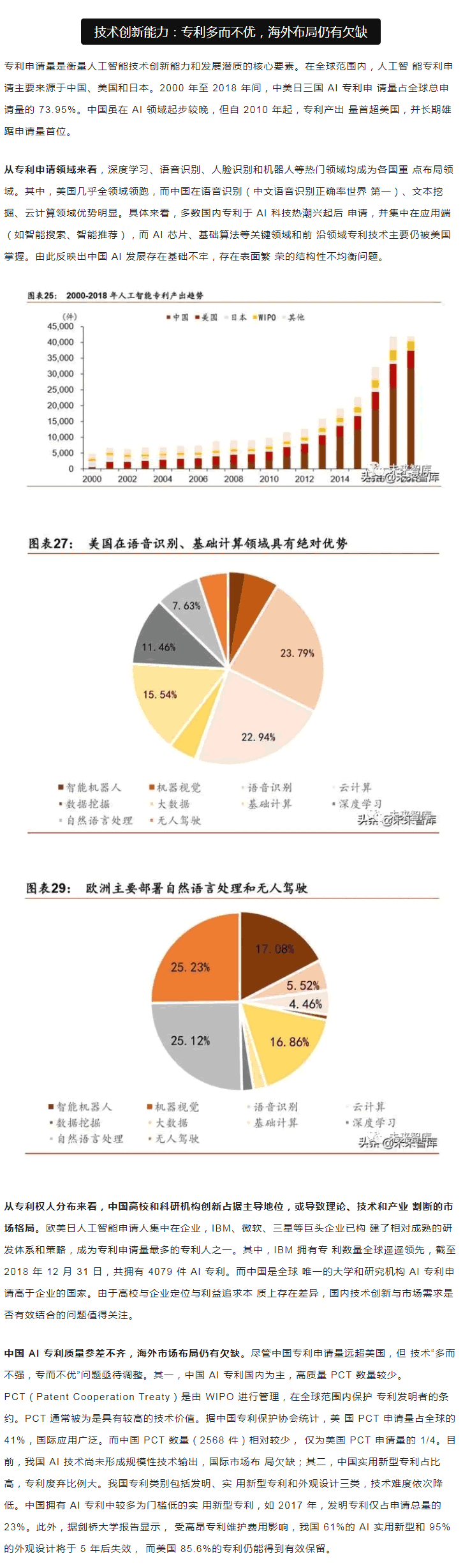 范圍內(nèi),中美“雙雄并立”構(gòu)成人工智能D一梯隊,日本、英國、以色列和法國等發(fā) 達國家乘勝追擊,構(gòu)成D二梯隊。同時,在D層設計上,多數(shù)國家強化人工智能戰(zhàn)略布局, 并將人工智能上升至國家戰(zhàn)略,從政策、資本、需求三大方面為人工智能落地保駕護。后起之秀的中國,局部L域有所突破。中國人工智能起步較晚,發(fā)展之路幾經(jīng)沉浮。自 2015 年以來,政府密集出臺系列扶植政策,人工智能發(fā)展勢頭迅猛。由于初期我國政策 側(cè)重互聯(lián)網(wǎng)L域,資金投向偏向終端市場。因此,相比美國產(chǎn)業(yè)布局,中國技術層(計算 機視覺和語音識別)和應用層走在世界前端,但基礎層核心L域(算法和硬件算力)比較 薄弱,呈“頭重腳輕”的態(tài)勢。當前我國人工智能在國家戰(zhàn)略層面上強調(diào)系統(tǒng)、綜合布局。