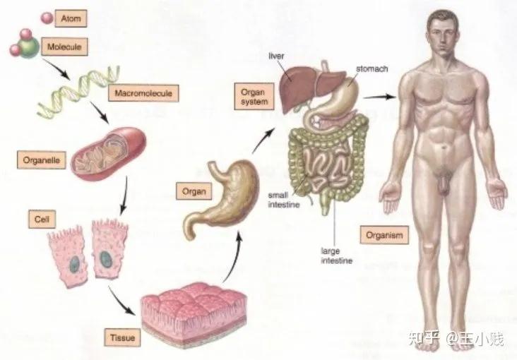 通過上一節(jié)的介紹我們也了解到,深度學習的黑箱性主要來源于其G度非線性性質(zhì),每個神經(jīng)元都是由上一層的線性組合再加上一個非線性函數(shù)的得到,我們無法像理解線性回歸的參數(shù)那樣通過非常solid的統(tǒng)計學基礎(chǔ)假設(shè)來理解神經(jīng)網(wǎng)絡(luò)中的參數(shù)含義及其重要程度、波動范圍。但實際上我們是知道這些參數(shù)的具體值以及整個訓練過程的,所以神經(jīng)網(wǎng)絡(luò)模型本身其實并不是一個黑箱,其黑箱性在于我們沒辦法用人類可以理解的方式理解模型的具體含義和行為,而神經(jīng)網(wǎng)絡(luò)的一個非常好的性質(zhì)在于神經(jīng)元的分層組合形式,這讓我們可以用物質(zhì)組成的視角來理解神經(jīng)網(wǎng)絡(luò)的運作方式。比如如下圖所示,人體的組成過程是從分子-細胞-組織-器官-系統(tǒng)-人體: