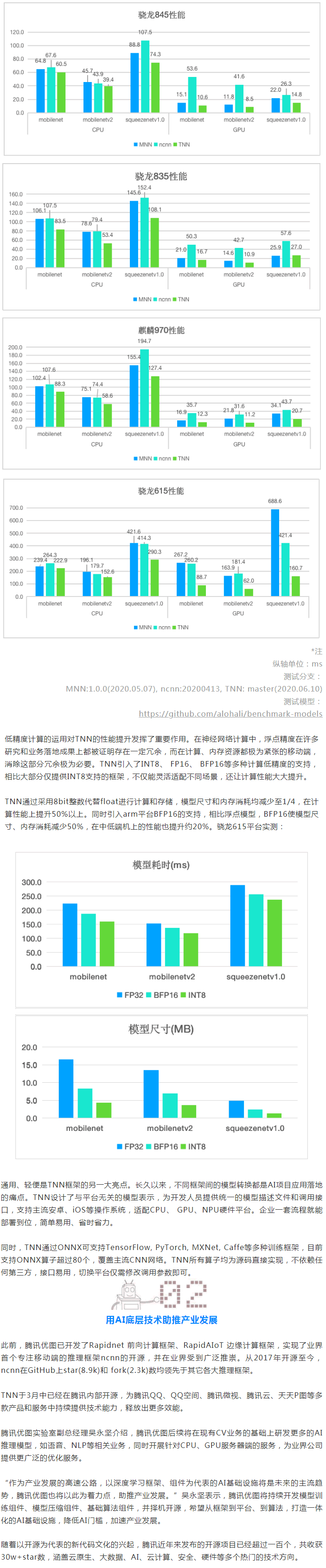 6月10日,騰訊優圖實驗室宣布正式開源新一代移動端深度學習推理框架TNN,通過底層技術優化實現在多個不同平臺的輕量部署落地,性能優異、簡單易用。騰訊方面稱,基于TNN,開發者能夠輕松將深度學習算法移植到手機端G效的執行,開發出人工智能 App,真正將 AI 帶到指尖。
