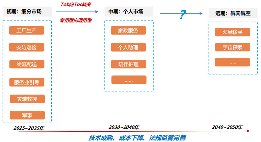 ,由tob轉(zhuǎn)為toc,進入家政等市場。更遠期,人形機器人有望應(yīng)用于航天航空L域,切合Musk火星移民構(gòu)