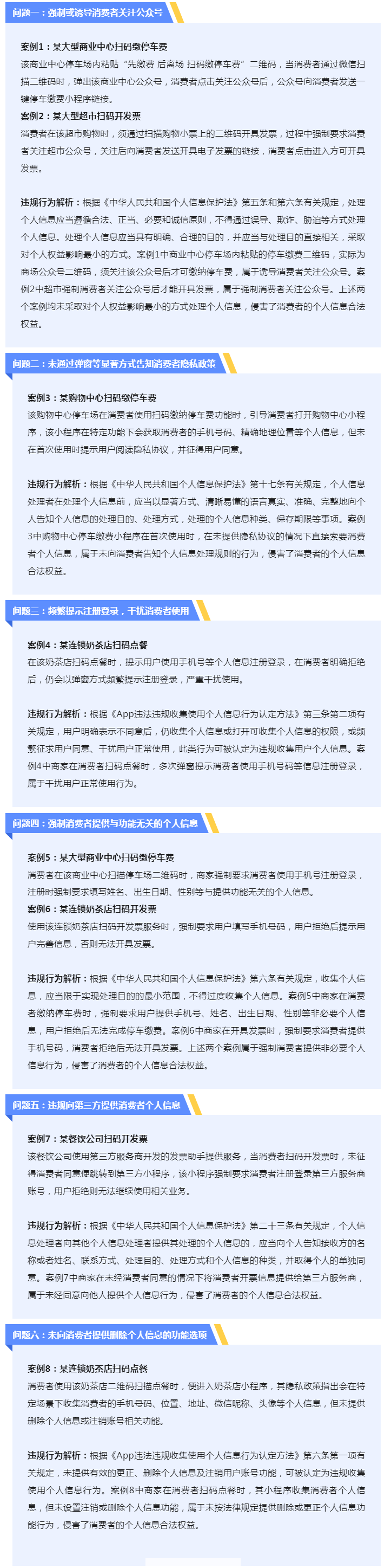 為進一步規范我市掃碼消費服務經營行為,切實保護消費者個人信息合法權益,綜合對我市提供掃碼消費服務二維碼抽樣測試情況,對六類常見易發違規問題進行案例解析,根據《中華人民共和國個人信息保護法》《App違法違規收集使用個人信息行為認定方法》等法律法規,提出六條合規指引,供全市提供掃碼消費服務的經營者遵照執行。