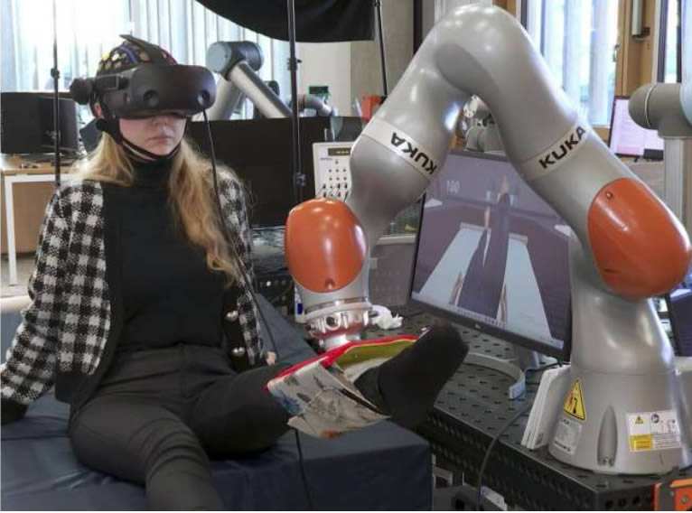 中風后的患者,以及在某種程度上經歷過脊髓創傷的患者經常需要進行康復訓練,試圖重新連接大腦中移動患肢的意圖和實際的肌肉運動。該研究團隊設計了一個集以下所有功能于一身的訓練系統:一個虛擬現實耳機,它能促使患者朝著虛擬目標發起腿部運動,并產生獨立運動的錯覺;一個神經接口,它能記錄患者的運動意圖;一個機器人,由于我們自己的軟件,它能以自然的方式移動腿部和脊髓的經皮電刺激,粗略地說,這會放大來自大腦的信號。