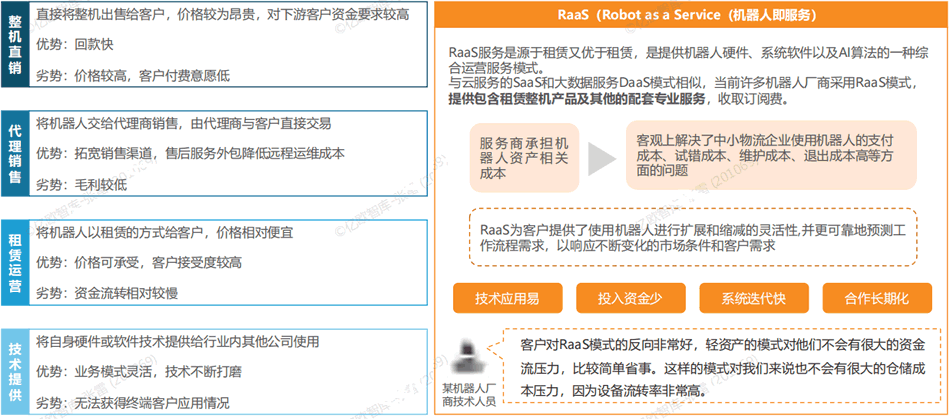 目前服務機器人廠商商業(yè)模式主要為五類:直銷、分銷、租賃、技術授權、RaaS