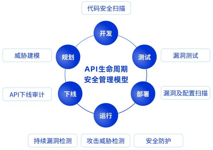 其次,API在整個(gè)業(yè)務(wù)生命周期當(dāng)中變化非常快,API實(shí)現(xiàn)邏輯一旦發(fā)生變化,很容易引入新的風(fēng)險(xiǎn)。因此,從API全生命周期來(lái)考慮API安全,圍繞規(guī)劃、開(kāi)發(fā)、測(cè)試、部署、運(yùn)行到下線的每一個(gè)環(huán)節(jié)加強(qiáng)安全建設(shè)顯得尤為重要。