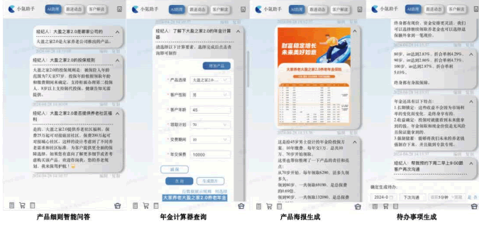 保險AI大模型助手在保險代理人與客戶溝通中的廣泛應用,提供實時問答支持和資料查詢功能,簡化了代理人查詢產品資料的流程,減少了溝通次數,提升了客戶服務效率和質量,增強了客戶體驗和滿意度。這些創新技術和功能的實施,顯著提升了代理人的工作效率和專業能力,有效支持了保險企業在競爭激烈的市場中保持競爭優勢。