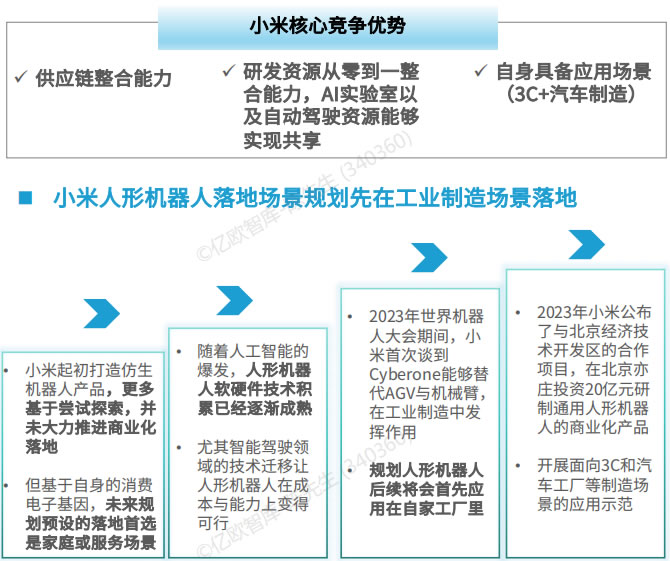 小米制造人形機器人的初衷背后主要是由于小米自2017年起就采取了“先確索后賦能” 的研發(fā)路徑,希望不斷通過自身的實踐先行—步,為產(chǎn)業(yè)鏈 賦能。由于其本身有著自己的龐大的生產(chǎn)任務(wù),從而希望人形機器人在3C和汽車制造L域,替代部分現(xiàn)在工業(yè)機器人無法模成的工作。
