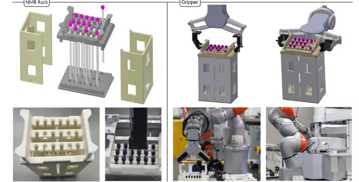 用于移動(dòng) agent 處理的定制核磁共振機(jī)架。左圖:組裝好的機(jī)架預(yù)先裝有核磁共振管,并放置在 ISynth 平臺(tái)內(nèi),然后液體輸送工具將液體分配到管子中,管子有帶孔的蓋子,以便分配。右圖:NMR-Agent 使用定制的指尖,使其能夠垂直和水平地抓握和移動(dòng)機(jī)架。垂直握把方向用于從 ISynth 甲板上取下機(jī)架,水平握把方向用于將機(jī)架移入臺(tái)式核磁共振自動(dòng)采樣器。