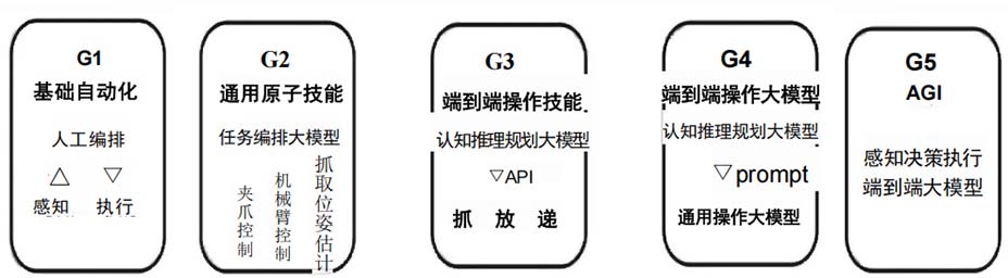 同時(shí),智元還定義了G1 至 G5 的具身智能技術(shù)演進(jìn)路線。G1 主要針對(duì)特定場景;G2 面向更多場景任務(wù), 具有一定的泛化能力;G3 從原先的算法驅(qū)動(dòng)轉(zhuǎn)變?yōu)閿?shù)據(jù)驅(qū)動(dòng);G4 引入了仿真數(shù)據(jù)和世界模型;G5 致力于 從感知到執(zhí)行,具備G度的自主性和適應(yīng)性。目前智元處于G2和G3階段,已在G2路線取得階段性突破, 實(shí)現(xiàn)了UniPose、UniGrasp、UniPlug 的通用原子模型,G3 路線上也形成了全流程具身數(shù)據(jù)方案AIDEA。