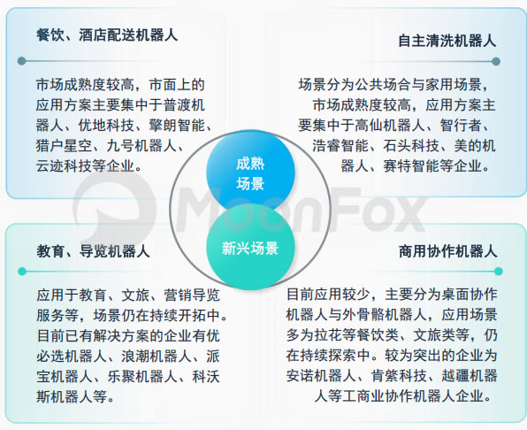 商用機(jī)器人應(yīng)用場(chǎng)景繁多,需求分散。目前成熟的應(yīng)用場(chǎng)景主要為商業(yè)配送、清洗場(chǎng)景,所需的功能集中于準(zhǔn)確導(dǎo)航、路線規(guī)劃、人機(jī)交互等。正在發(fā)展的場(chǎng)景如教育應(yīng)用、商業(yè)協(xié)作等場(chǎng)景注重于更有啟發(fā)性的交互引導(dǎo)和更準(zhǔn)確的機(jī)械操作。商業(yè)服務(wù)L域憑借其廣泛的受眾、活躍的市場(chǎng)以及對(duì)創(chuàng)新的G度接納性,能使