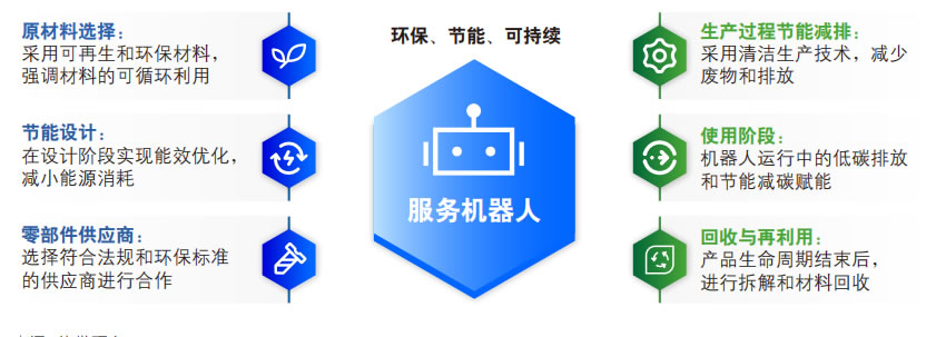 服務機器人行業有著技術創新驅動和多領域應 用的特點 ,其生產和使用對環境的影響尤為重 要。當前范圍內環境保護法規和政策不斷 加強 ,對G科技行業的環境責任提出了更G要 求。消費者和投資者越來越關注企業的環境責 任 ,企業的環境表現直接影響服務機器人企業 的品牌形象和市場競爭力。本白皮書經過充分 調研 ,證明通過以下策略可有效構建服務機器 人行業的綠色供應鏈: