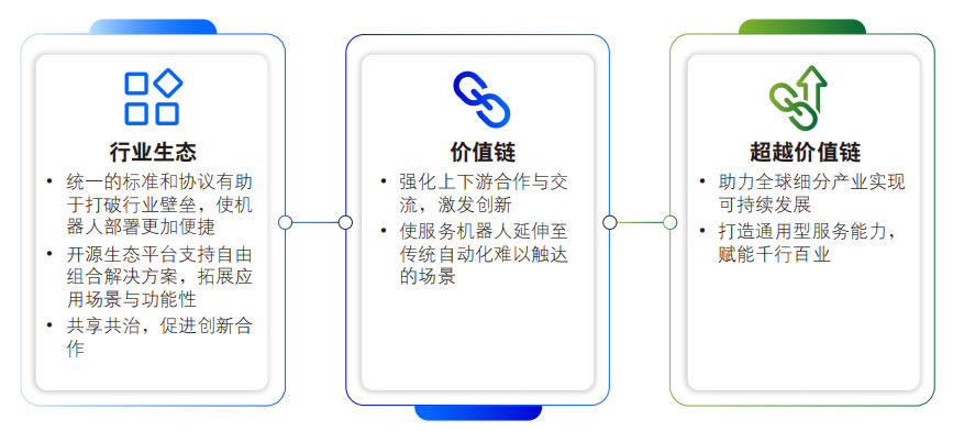 通過構建開放性的全棧式智能服務機器人生 態 ,服務機器人將成為推動可持續發展 的重要引擎 。開放性的技術體系將打破行業 壁壘 ,基于統一協議標準實現R2X 萬物互聯 與資源共享 ,顯著降低服務機器人的應用門 檻 ,使更多用戶能夠便捷部署服務機器人 。