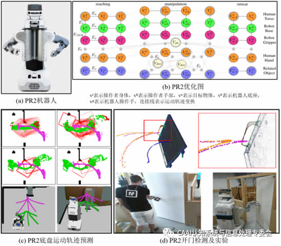 Personal Robot 2(PR2)[5]是Willow Garage開發(fā)的移動式操作機器人平臺(如圖2(a)),它配備兩個兼容7自由度機械臂和機械手,在頭部、胸部、肘部、夾爪上分別安裝有G分辨率攝像頭、激光測距儀、慣性測量單元、觸覺傳感器等豐富的傳感設備,通過底部的四輪移動平臺可無限擴展其作業(yè)范圍,提供基于Ros系統(tǒng)的仿真環(huán)境,可模擬開門、打臺球和畫畫等復雜操作,適用于科研的實驗平臺。Welschehold[6]在PR2實現(xiàn)了從人的開門操作動作示教中學習移動底盤的運動方式以及夾持器的操作姿態(tài),作者將機器人的學習分為三個部分的軌跡預測包括示教者的手部運動軌跡、示教者的身體移動軌跡以及被操作物體的運動軌跡,后通過超圖優(yōu)化方式的來預測機器人底盤運動和操作機械臂的運動軌跡(如圖2(b)-(d))。