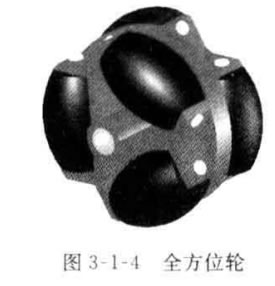 全方位輪種類很多,本節以圖3-1-4中所示的全方 位輪為例進行討論,它的組成是在輪轂的外緣上設置有 可繞自己的軸旋轉的輥子,且均勻分布于輪轂周圍,這 些輥子軸線(E) 和輪轂軸線(S,) 的夾角a 為90°。該麥 卡納姆輪由雙排自由滾動的輥子組成,使得輪子在地面 滾動時形成連續的接觸點。而在運動時輪轂是驅動機 構,輥子是從動機構,因此在本節中主動輪由圖3-1-5 所示車輪輪轂與邊沿輥子組成,從動輪為車輪輥子,主 動輪、從動輪與地面接觸點均為輥子與地面的接觸點。