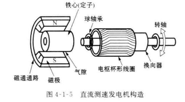 如圖4-1-5所示,直流測速發(fā)電機(jī)的定子是永久磁鐵,轉(zhuǎn)子是線圈繞組。它的 原理和永久磁鐵的直流發(fā)電機(jī)相同,轉(zhuǎn)子產(chǎn)生的電壓通過換向器和電刷以直流電 壓的形式輸出,可以測量0~10000r/min 量J的旋轉(zhuǎn)速度,線性度為0 . 1 % 。 此 外,停機(jī)時(shí)不易產(chǎn)生殘留電壓,因此,它Z適宜作速度傳感器。但是電刷部分是機(jī)械接觸,需要注意維修,另外,換向器在切換時(shí)產(chǎn)生脈動(dòng)電壓,使測量精度降低。因 此,現(xiàn)在亦有用無刷直流測速發(fā)電機(jī)。