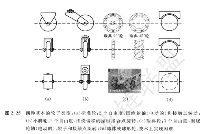 有四種主要的輪子類型,如圖2.25所示。在運動學(xué)方面,它們差別很大。因此 輪子類型的選擇對移動機器人的整個運動學(xué)有很大的影響。標準輪和小腳輪有一個 旋轉(zhuǎn)主軸,因而是高度有向的。在不同的方向運動,需要先沿著垂直軸操縱輪子。 這兩種輪的主要差別在于標準輪可以完成操縱而無副作用,因為旋轉(zhuǎn)中心經(jīng)過接觸 片著地;而小腳輪繞偏心軸旋轉(zhuǎn),在操縱期間會引起一個力,加到機器人的底盤。