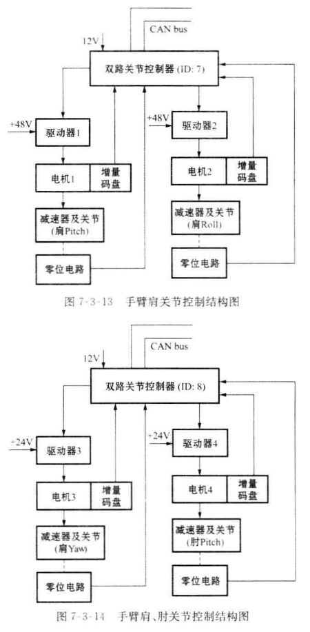 手臂各關(guān)節(jié)控制電路采用分布式控制系統(tǒng),各關(guān)節(jié)控制器(主 MCU 是 TMS320LF2407)由CAN 總線相連(CAN2.0-A 版本)。控制周期為5m (即上位機(jī) 與 所 有 關(guān) 節(jié) 控 制 器 通 信 一 遍 , 再 加 一 定 裕 度 后 的 時(shí) 間 ) 。 各 關(guān) 節(jié) 控 制 電 路 結(jié) 構(gòu) 如