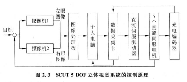 SCUT 5 DOF 立體視覺系統的控制原理如圖2.3所示,兩個彩色攝像機拍攝待識別 目標圖像,經過圖像處理板后送入個人電腦進行分析,經過顏色或特征跟蹤算法處理后, 形成5個直流電機的轉角控制指令,并經由數據采集卡和直流電機驅動器放大后驅動5個直流電機轉動,從而帶動兩個攝像機分別或共同作上、下、左、右、旋轉運動,跟蹤待識 別目標。無論待識別的目標怎樣活動,只要不離開兩個攝像機的視覺范圍,這個跟蹤和 識別過程就一直持續地進行下去。由圖2 .3可以看到,5個直流電機的輸出(它們的轉 動,即兩個攝像機的運動)是直接連接到或者說跟蹤目標的。