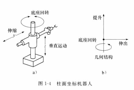 柱面坐標機器人主要由垂直柱子、 水平手臂(或機械手)和底座構成。水平 機械手裝在垂直柱子上,能自由伸縮, 并可沿垂直柱子上下運動。垂直柱子安 裝在底座上,并與水平機械手一起(作 為 一個部件)能在底座上移動。這樣, 這種機器人的工作包跡(區間)就形成一 段圓柱面,如圖1-4所示。因此,把這種機器人叫做柱面坐標機器人。