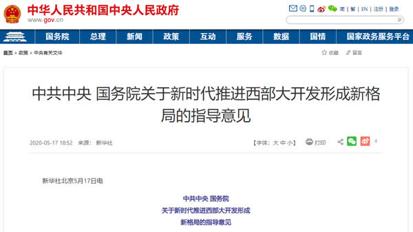 5月17日,、國務院發布了一份將改寫東西格局的重磅文件——《關于新時代推進西部大開發形成新格局的指導意見》(下稱《意見》),強化舉措推進西部大開發形成新格局。
