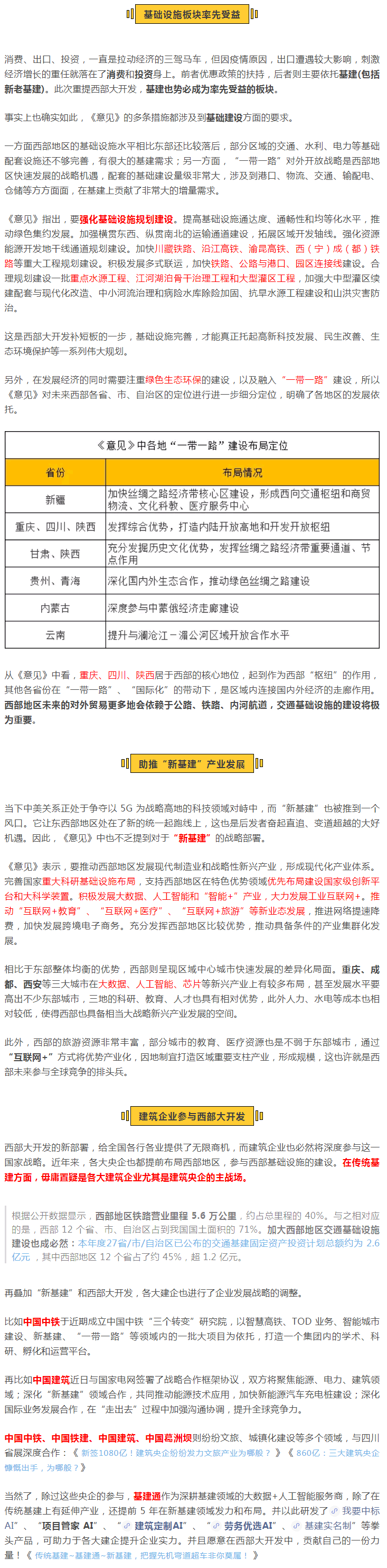 《意見》從推動G質量發展、加大西部開放力度、加大美麗西部建設力度、深化重點L域改革等七個方面提出了 36 條舉措,涉及政策、基建、產業和規劃等,對新時代推進西部大開發形成新格局作出了部署,因此也被稱為“新的西部大開發戰略”。