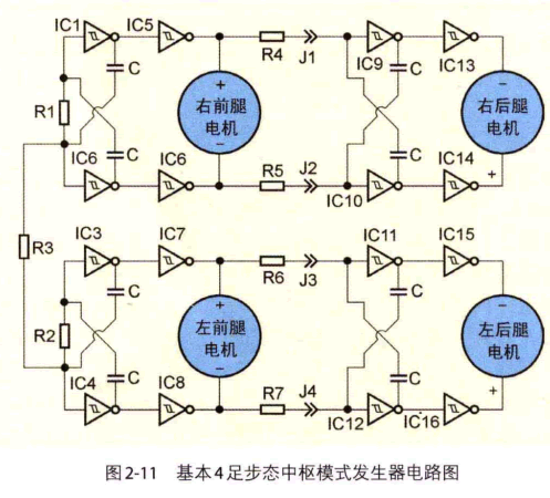一個Z 簡單的基于步態的中樞模式發生器 , 用電路來模擬生物腰部脊椎區域的神經網絡 , 產 生 出 一 組 間 歇 性 的 肌 肉 信 號 , 驅 動 一 個 4 足 機 器 人 , 電 路 如 圖 2 - 1 1 所 示 。