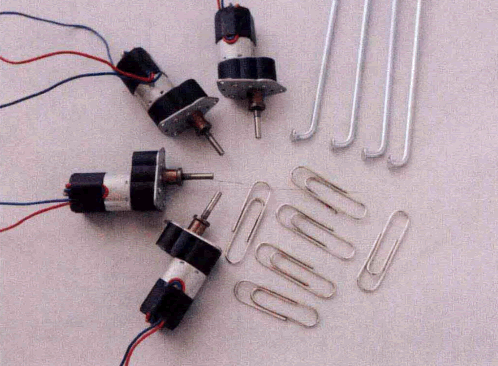 機器人對電機的要求不高,只要體積小巧、輸出軸為3mm (方便和接線端子 芯改裝的簡易軸連器連接)、轉(zhuǎn)速不要太快(比較理想的數(shù)值是20r/min以 下 ) 就 可以了。車條和曲別針是隨手可得的常見材料,接下來就考驗你的手工了。