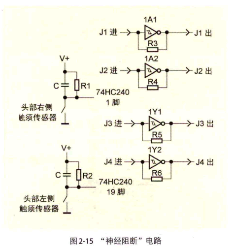 這個(gè)電路的原理很簡(jiǎn)單,74HC240 構(gòu)成了兩個(gè)為一組的電子開(kāi)關(guān)。注意這次 74HC240 的使能端——1腳和19腳不直接接地,而是連接到了觸須傳感器和RC 網(wǎng) 絡(luò)。當(dāng)機(jī)器人前方?jīng)]有物體時(shí),幾個(gè)電子開(kāi)關(guān)處于開(kāi)路狀態(tài), CPG 網(wǎng)絡(luò)中相當(dāng)于插 入了4個(gè)固定電阻 (R3 、R4 、R5 和R6), 因?yàn)樗鼈兊淖柚当容^低,對(duì)神經(jīng)網(wǎng)絡(luò)的 影響可以忽略不計(jì)。