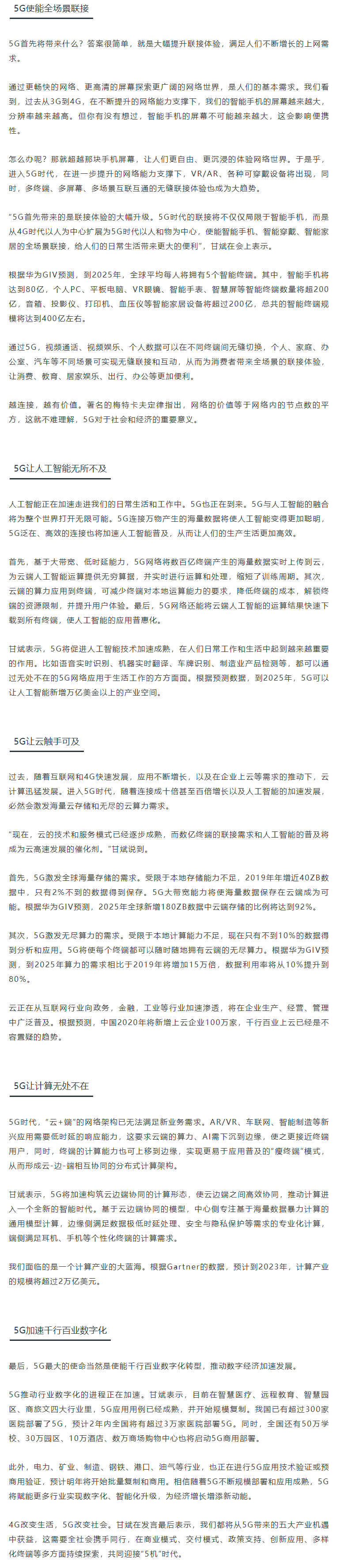 2020年6月30日,在GSMA舉辦的新基建與企業(yè)數(shù)字化論壇上,華為無(wú)線(xiàn)網(wǎng)絡(luò)S席營(yíng)銷(xiāo)官甘斌發(fā)表了《5G=5“機(jī)”,新價(jià)值,新機(jī)遇》的主題演講。會(huì)上,甘斌詮釋了5G將驅(qū)動(dòng)聯(lián)接、AI、云、計(jì)算、行業(yè)應(yīng)用五大產(chǎn)業(yè)升級(jí),為數(shù)字經(jīng)濟(jì)發(fā)展注入新動(dòng)能。