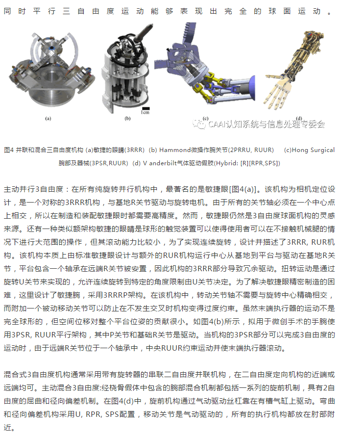 串行RRR方法在工業(yè)機械臂應(yīng)用中非常普遍。許多商用工業(yè)武器,如Kuka k -16、川崎k系列、發(fā)那科M系列、DurrEcoPaint、鴻海/ Foxconnrobot arms和巴雷特WAM[圖2(b)]。這三個關(guān)節(jié)的軸在一個共同點上相交球形末端執(zhí)行器運動,并為機器人手臂更近端的關(guān)節(jié)提供平移運動與球形手腕運動解耦。當(dāng)兩個“滾”軸共線時,這種設(shè)計常常導(dǎo)致在零位置出現(xiàn)奇異點。然而,在包裝約束的運動范圍和靈活性(輥電機和齒輪系可以放置遠(yuǎn)離旋轉(zhuǎn)中心)使這種配置吸引和適合工業(yè)武器。要注意的是,這些臂內(nèi)的俯仰和其中一個滾轉(zhuǎn)角通常是通過傘齒輪差速器驅(qū)動的,這使得電機可以沿著腕關(guān)節(jié)的縱向放置,節(jié)省空間,并可能減少轉(zhuǎn)動慣量。滾-槳-滾設(shè)計也用于類人機器人、用于衛(wèi)星服務(wù)的機器人手臂和外科機器人手腕,代替使用D二列滾動關(guān)節(jié),一些手腕設(shè)計實現(xiàn)3自由度的運動通過滾動-傾斜-偏航配置。在這種情況下,偏航軸垂直于橫搖軸和俯仰軸,對應(yīng)于人手腕的徑向偏差。當(dāng)偏航軸與俯仰軸和滾轉(zhuǎn)軸相交時,該機構(gòu)通常被認(rèn)為是一個球形腕關(guān)節(jié),也可以被認(rèn)為是一個RU鏈。除了手術(shù)臂和工業(yè)臂,因為滾-滾-滾手腕與人的手腕相似,所以也經(jīng)常用于人形或擬人化機械臂。一些系列腕設(shè)計選擇使用單一的球關(guān)節(jié)而不是串行鏈,雖然整體幾何形狀是一個球和窩接接頭,但球?qū)嶋H上是轉(zhuǎn)子,窩接接頭是定子。