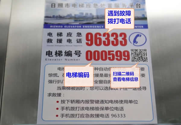 平臺對錄入的每臺電梯都進行了準確定位,并且在轎廂內(nèi)張貼標(biāo)識牌,標(biāo)識牌上有電梯應(yīng)急救援電話“96333”以及每臺電梯對應(yīng)的編號。市民乘坐電梯偶遇故障被困時,可撥打“96333”救援熱線電話,告知接線人員電梯編碼,即可對所乘電梯的所在小區(qū)、單元樓實施迅速定位,安排專業(yè)人員前去救援。市民在日常乘梯時也可憑借96333應(yīng)急處置平臺的數(shù)據(jù)歸集,掃描標(biāo)識牌二維碼,獲知電梯檢驗、維保、投保、管理等情況,參與電梯安全管理社會共治。