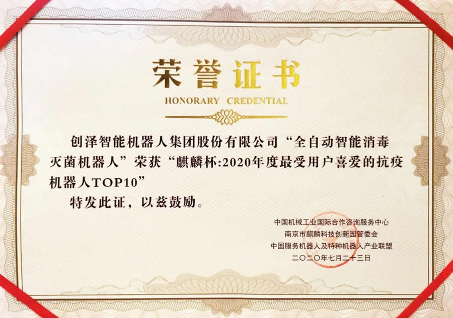 2020年7月23日,由中國機(jī)械工業(yè)國際合作咨詢服務(wù)中心、南京麒麟科創(chuàng)園管委會、中國服務(wù)機(jī)器人及特種機(jī)器人產(chǎn)業(yè)聯(lián)盟聯(lián)合主辦的2020第六屆國際服務(wù)機(jī)器人產(chǎn)業(yè)G峰論壇暨“第三屆麒麟杯頒獎典禮在南京舉行。此次典禮上,中國智能服務(wù)機(jī)器人L軍企業(yè)創(chuàng)澤集團(tuán)被授予“麒麟杯:2020年度受用戶喜愛的抗疫機(jī)器人TOP10”榮譽(yù)證書。